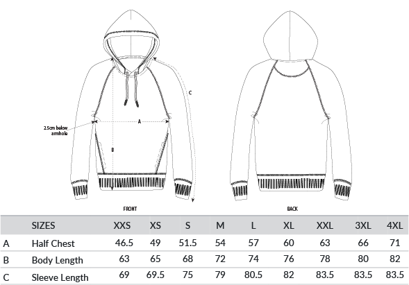 Raglan sleeve. Double-layered hood in self-fabric. Round drawcords in matching body colour with metal tipping. Metal eyelets. Inside herringbone back neck tape. Self-fabric half-moon at back neck. Slanted side seams with pockets. 1x1 rib at sleeve hem and bottom hem. Flatlock top-stitch on all seams. Vegan certified. Fairwear Foundation certified. Oeko-Tex certified.