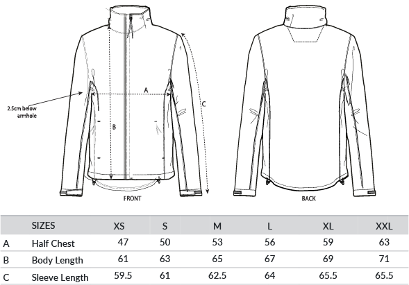 Medium fit with a high collar and set-in sleeve. Bottom hem with adjustable plastic stopper and elastic cord. Reverse nylon zip at centre front. Zipped outside welt pockets with reflective elastic puller. Fully bonded inside fleece layer. Side panels and stretch for better shape. Adjustable hook and loop sleeve opening. Inside seams finished with recycled binding. Water-repellent up to 10,000mm, breathability up to 3000G/M2/24hrs allowing perspiration to escape. Windproof. Bionic ECO DWR (durable, water-repellent) finish. Global Recycle Standard certified, OEKO-TEX certified, Vegan certified, Fairwear.